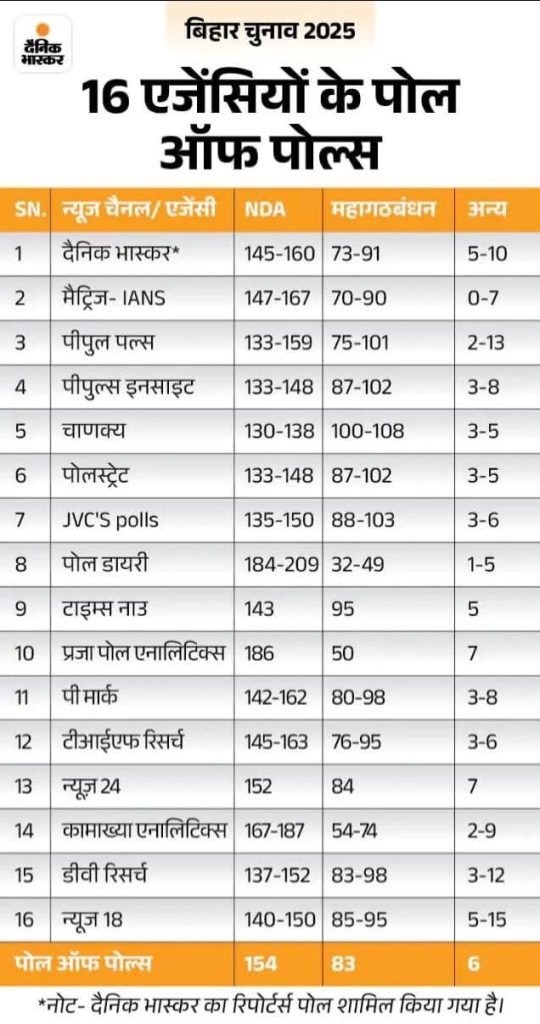 Kamlakant Pandey / Patna : बिहार विधान सभा चुनाव एग्जिट पोल में एनडीए को बहुमत मिला है। अब तक छह एजेंसियों के एग्जिट पोल में एनडीए को फिर से बहुमत दिया गया है। दैनिक भास्कर की रिपोर्ट पोल में भी एनडीए को 145-160 सीटें और महागठबंधन को 73-91 सीटें दिए गए हैं। बाकी विभिन्न प्रेस सहित अन्य सर्वे संस्थान के रिपोर्ट को नीचे खाका में अवलोकनार्थ अंकित किए गए हैं। बस, दो दिनों का और इंतजार पक्ष-विपक्ष के नेताओं एवं समर्थकों को करना पड़ेगा। इसके साथ बिहार विधानसभा चुनाव के दूसरे और आखिरी चरण का मतदान आज 68.6% की वोटिंग का ऐतिहासिक रिकार्ड बना है। 20 जिलों की 122 सीटों के लिए वोट डाले गए हैं। अंतिम चरण में बंपर वोटिंग हुई है। शाम 5 बजे तक 67.14 प्रतिशत मतदान हुआ। पिछली बार से अधिक मतदान हुआ है। पहले चरण में 6 नवंबर को राज्य के 18 जिलों में 121 विधानसभा सीटों पर आजादी के बाद सर्वाधिक 65% वोटिंग हुई थी।