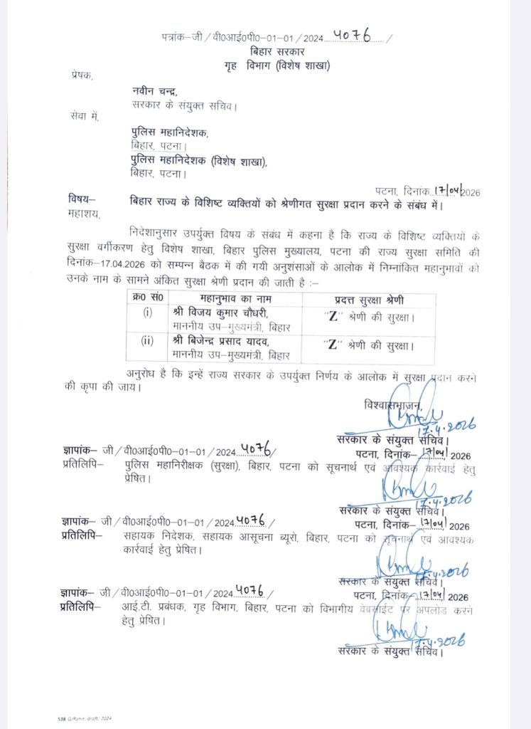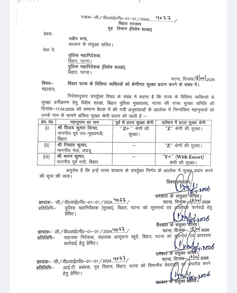 अधिसूचना के अनुसार, बिहार के दोनों उपमुख्यमंत्रियों विजय कुमार चौधरी और विजेंद्र प्रसाद यादव को ‘Z’ श्रेणी की सुरक्षा प्रदान की गयी है। यह निर्णय राज्य सुरक्षा समिति की बैठक में हुई अनुशंसाओं के आधार पर लिया गया। वहीं, दूसरे आदेश में विजय कुमार सिन्हा की सुरक्षा ‘Z+’ से घटाकर ‘Z’ कर दी गयी है। इसके अलावा निशांत कुमार को पहली बार ‘Z’ श्रेणी की सुरक्षा दी गयी है। मंत्री श्रवण कुमार को ‘Y+ (एस्कॉर्ट सहित)’ की श्रेणी में रखा गया है। गृह विभाग के आदेश में स्पष्ट किया गया है कि यह सभी निर्णय बिहार पुलिस मुख्यालय की विशेष शाखा द्वारा की गयी सुरक्षा समीक्षा और राज्य सुरक्षा समिति की सिफारिशों के अनुरूप लिये गये हैं।