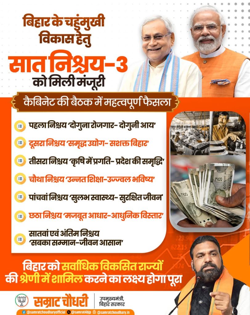 उपमुख्यमंत्री सह गृहमंत्री सम्राट चौधरी ने कहा कि बीते 20 वर्षों में राज्य में 50 लाख सरकारी नौकरी और रोजगार उपलब्ध कराने के बाद एनडीए ने अगले पांच वर्षों में 1 करोड़ सरकारी नौकरी और रोजगार देने का वादा बिहार की जनता से किया था। जनता ने एनडीए के उस ट्रैक रिकॉर्ड को याद रखा, जिसमें कथनी और करनी के बीच कोई अंतर नहीं है, और उसी भरोसे के आधार पर जनता ने 243 में से 202 सीटों के साथ प्रचंड बहुमत देकर फिर से सरकार चलाने का हमें जनादेश दिया। उन्होंने कहा कि यह जनादेश केवल सत्ता के लिए नहीं, बल्कि विकास की रफ्तार को तेज करने के लिए है। एनडीए सरकार ने सात निश्चय-3 को लागू करने का फैसला लेकर यह संकेत दे दिया है कि सरकार रुकने वाली नहीं है। बिहार मंत्रिमंडल की बैठक में सात निश्चय (2015–2020) और सात निश्चय-2 (2020–2025) के तहत तय लक्ष्यों को सफलतापूर्वक पूरा करने के बाद अब सात निश्चय-3 के जरिए विकास के अगले चरण की शुरुआत करने का निर्णय लिया गया है।
