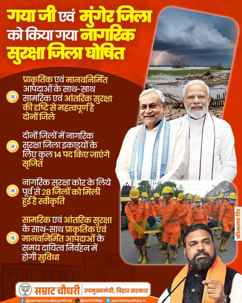 सरकार ने आशंका जतायी है कि युद्ध/शत्रु हमले की स्थिति में इन जिलों को लक्षित कर देश को नुकसान पहुंचाया जा सकता है। इसके अतिरिक्त इन दोनों जिलों में प्राकृतिक आपदाओं की भी आशंका हमेशा बनी रहती है। इसी को ध्यान में रखकर नागरिक सुरक्षा कोर के लिए पूर्व से स्वीकृत 28 जिलों के अतिरिक्त गयाजी एवं मुंगेर जिलों को भी इसमें शामिल किया गया है। इस बाबत बिहार के उपमुख्यमंत्री सह गृहमंत्री सम्राट चौधरी ने बताया कि मुख्यमंत्री नीतीश कुमार की अध्यक्षता में आज हुई मंत्रिमंडल की बैठक में गयाजी एवं मुंगेर जिलों को नागरिक सुरक्षा जिला घोषित किया गया है। प्राकृतिक एवं मानवनिर्मित आपदाओं के साथ-साथ सामरिक व आंतरिक सुरक्षा की दृष्टि से इन दोनों जिलों का महत्व और बढ़ गया है। दोनों जिलों में नागरिक सुरक्षा जिला इकाइयों के लिए कुल 14 पद सृजित किए जाएंगे।