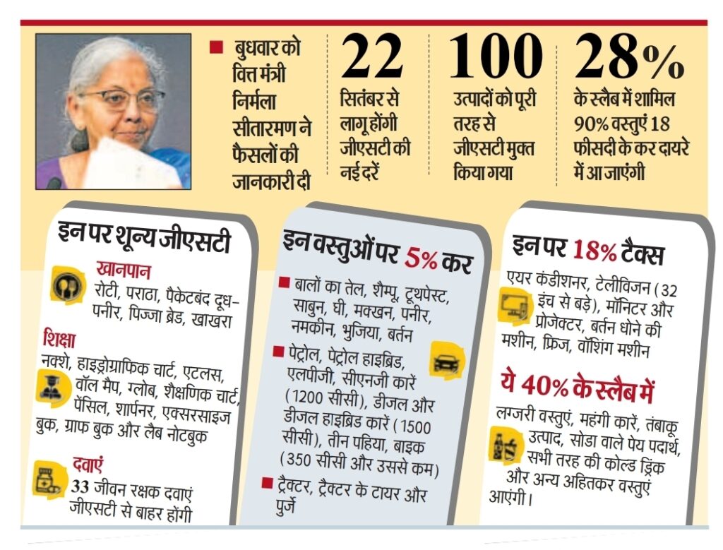 बहरहाल, जिन चीजों पर जीएसटी घटाकर 5 परसेंट किया गया है, उनमें हेयर ऑयल, टॉयलेट सोप, साबुन की टिकिया, शैंपू, टूथब्रश, टूथपेस्ट, साइकिल, टेबलवेयर, किचनवेयर और अन्य घरेलू सामान भी शामिल हैं। दूध, ब्रेड, छेना और पनीर पर जीएसटी जीरो कर दिया गया है। सभी भारतीय रोटियों पर जीएसटी जीरो होगा, जबकि खाद्य पदार्थ नमकीन, भुज्जिया, सॉस, पास्ता, इंस्टेंट नूडल्स, चॉकलेट, कॉफी, कॉर्नफ्लेक्स, मक्खन, घी ये सभी चीजें 5% वाले जीएसटी स्लैब के दायरे में हैं। 28% से घटाकर 18% वाले GST स्लैब में एयर कंडीशनिंग मशीनें, टीवी, डिशवॉशिंग मशीनें, छोटी कारें, मोटरसाइकिलें आदि को शामिल किया गया है। 33 जीवन रक्षक दवाइयों को जीएसटी स्लैब से बाहर कर दिया गया है। इसके अलावा ट्रैक्टर और कृषि मशीनरी पर जीएसटी घटाकर 12% से 5% कर दिया गया है। निर्माण क्षेत्र के लिए भी एक अहम फैसला लिया गया है। सीमेंट पर जीएसटी 28% से घटाकर 18% किया गया है, लेकिन केंद्रीय वित्त मंत्री ने साफ किया है कि लग्जरी कैटेगरी के सामानों पर टैक्स में कोई ढील नहीं होगी।